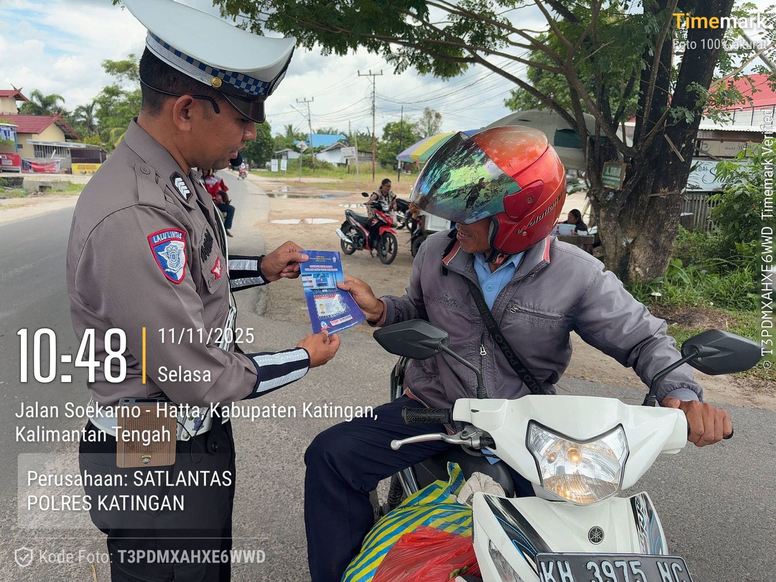 Personil Satlantas Polres Katingan sebagai anggota preemtif bergerak turun ke Jalan untuk meninformasikan kepada pengendara melalui pembagian brosur, untuk menciptakan keamanan dan keselamatan berlalu lintas.